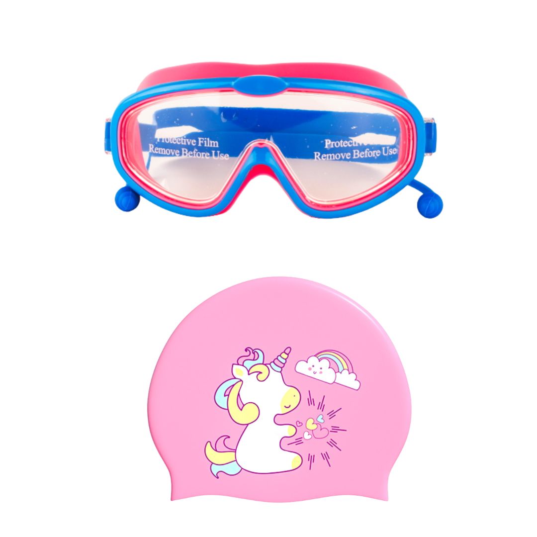 Pink Blue Swimming Goggole and Unicorn Cap Combo